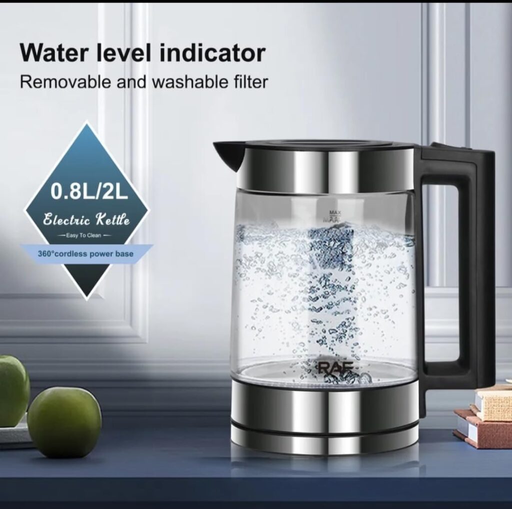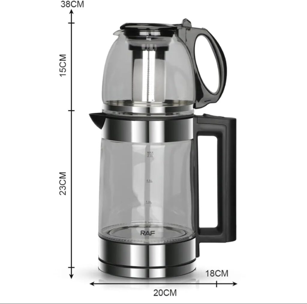 RAF 2L kettle with turkish teapot, 1500w 360 swivel base , bpa free interior, borosilicate glass. kettle of 2l capicity and teapot of 0.8l capisity